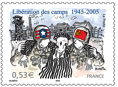 Le timbre de Plantu, illustre cet épisode dramatique : deux soldats, l'un américain l'autre russe soutiennent un prisonnier décharné, fantomatique, dont les raies du costume se perdent dans le bas du timbre comme si elles étaient détachées de ce corps meurtri par les privations, la maladie.Le dessin satirique, interpelle fortement le lecteur, ajoute une dimension nouvelle et grave au sujet : l'oeil est attiré, le regard capté mais très vite on s'attarde sur le fond : impossible d'oublier les sinistres miradors et les barbelés de Dachau, Mauthausen, Auschwitz, et, ce corps qui témoigne au premier plan de cette barbarie pourtant perpétrée par des hommes contre d'autres hommes : "n'oublions jamais !"